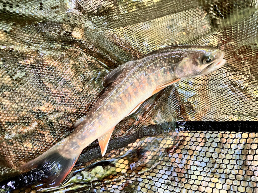湖から遡上しているので口は真っ黒ですが、体つきは虫しか食べてないのでスレンダー。エゾイワナと呼ぶには顔が可愛く無いのでアメマスということで。