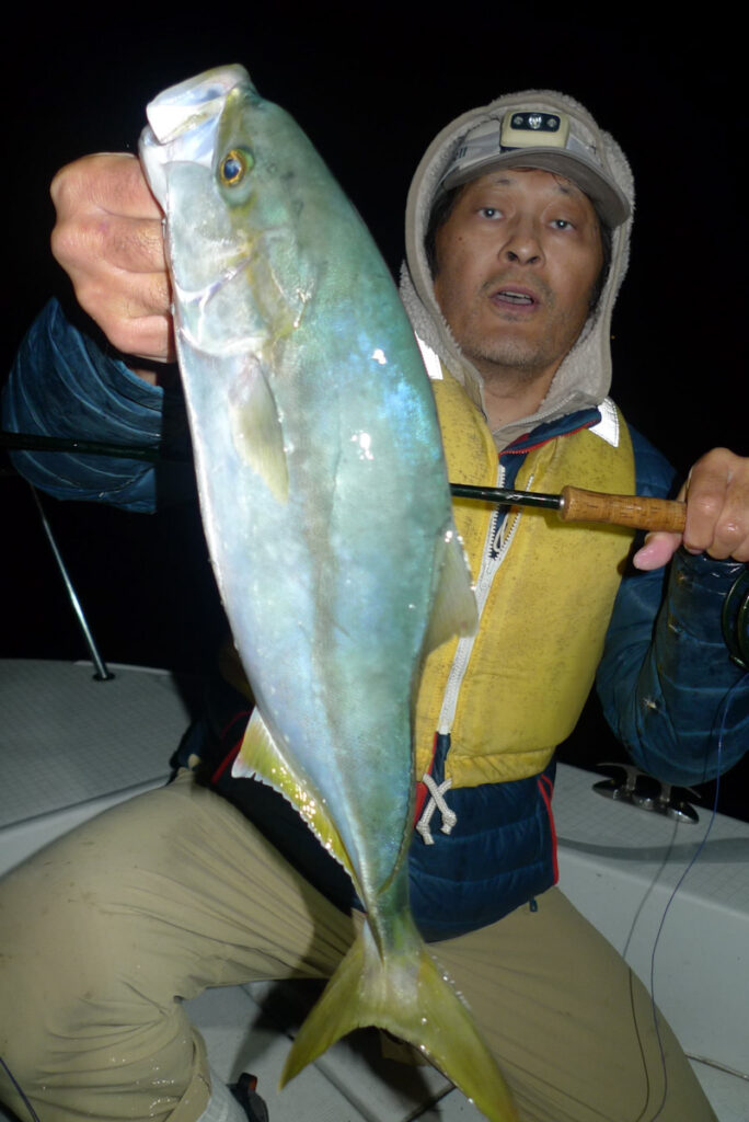イナダサイズですが、病み上がりボートシーバスの最中にシーバスとは違った変わったファイトをする魚がヒットしたので何かと思ったらイナダさんでした。ナイトゲームだと走らないので、安定ファイトでサイズUP。