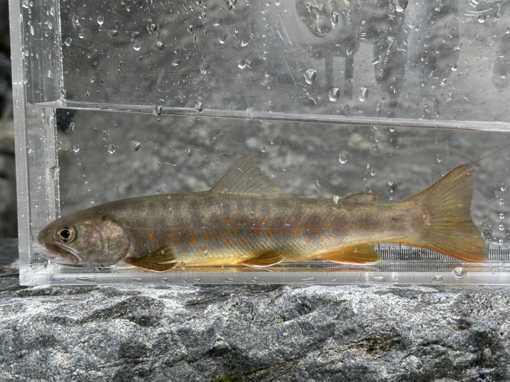 本州中部に生息する、環境レッドデータで「絶滅危惧種」に指定されているイワナ。放流されたニッコウイワナとの交配の影響と釣りによるプレッシャーが原因とされています。ニッコウイワナとの大きな違いは体の斑点。純粋なヤマトイワナにはオレンジの点はありますが、ほとんど白点がありません。このため黒っぽく見えます。