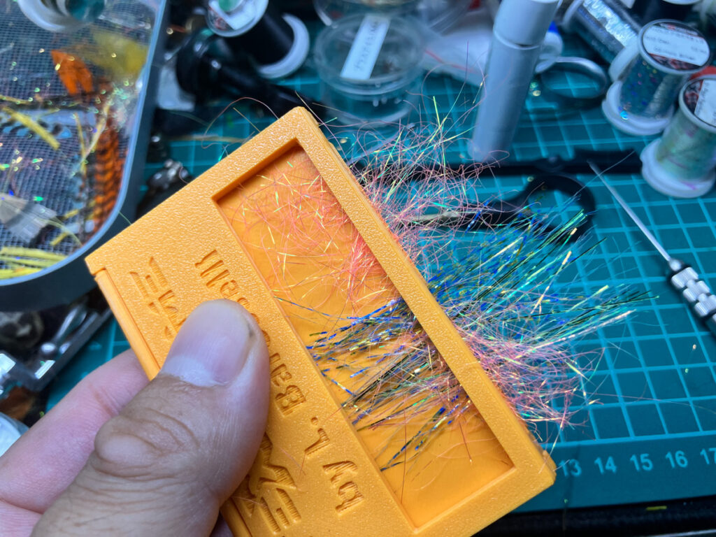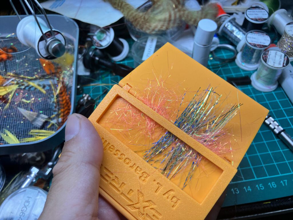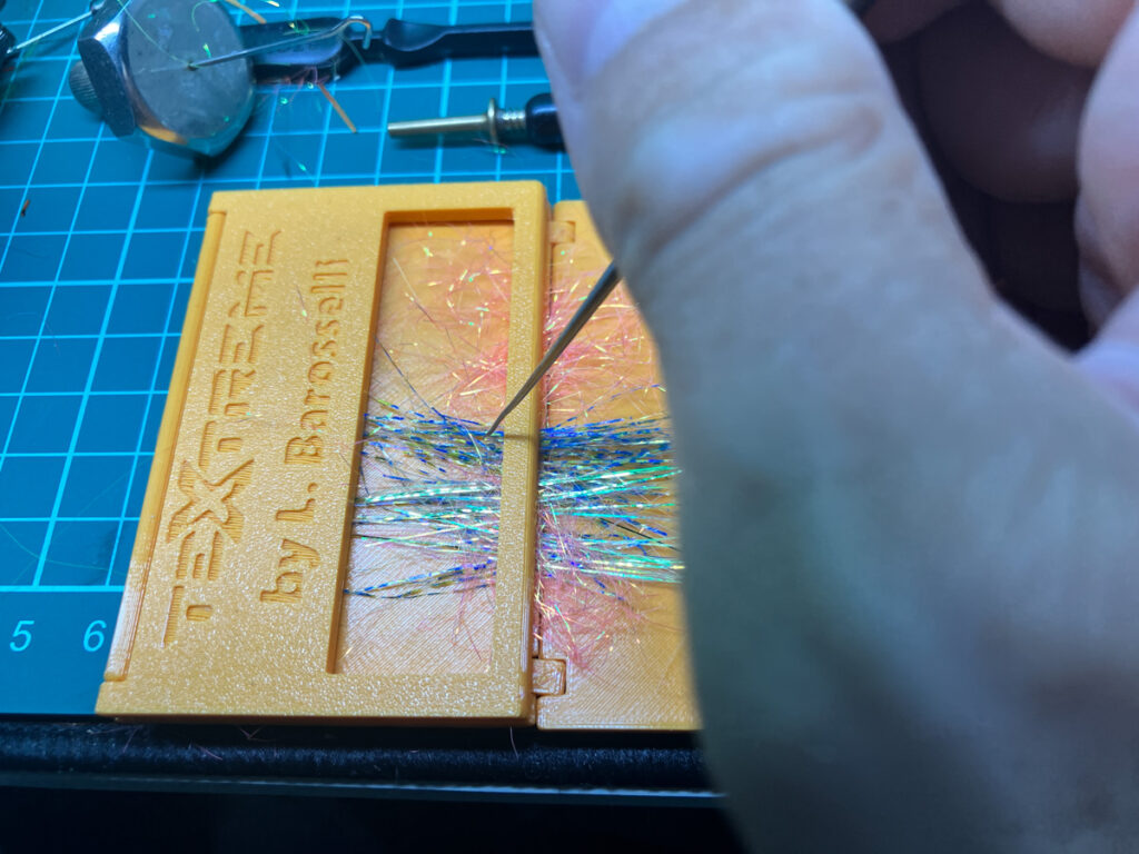 ダビングマスターを全展開してブレンドプレートの中央線を軸に、コンポジット・ハックルとして使いたいマテリアルをセットします。ここではダブリングして使うために50:50均等に置いています。