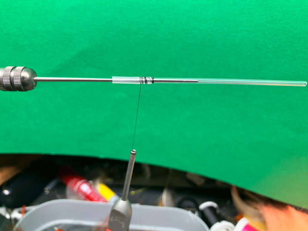 プラチューブにジャンクションチューブを差し込んだら、チューブフライ・ツールへ差し込んでバイスへセット。スレッドを重複部分にした巻きして固定しておきます。