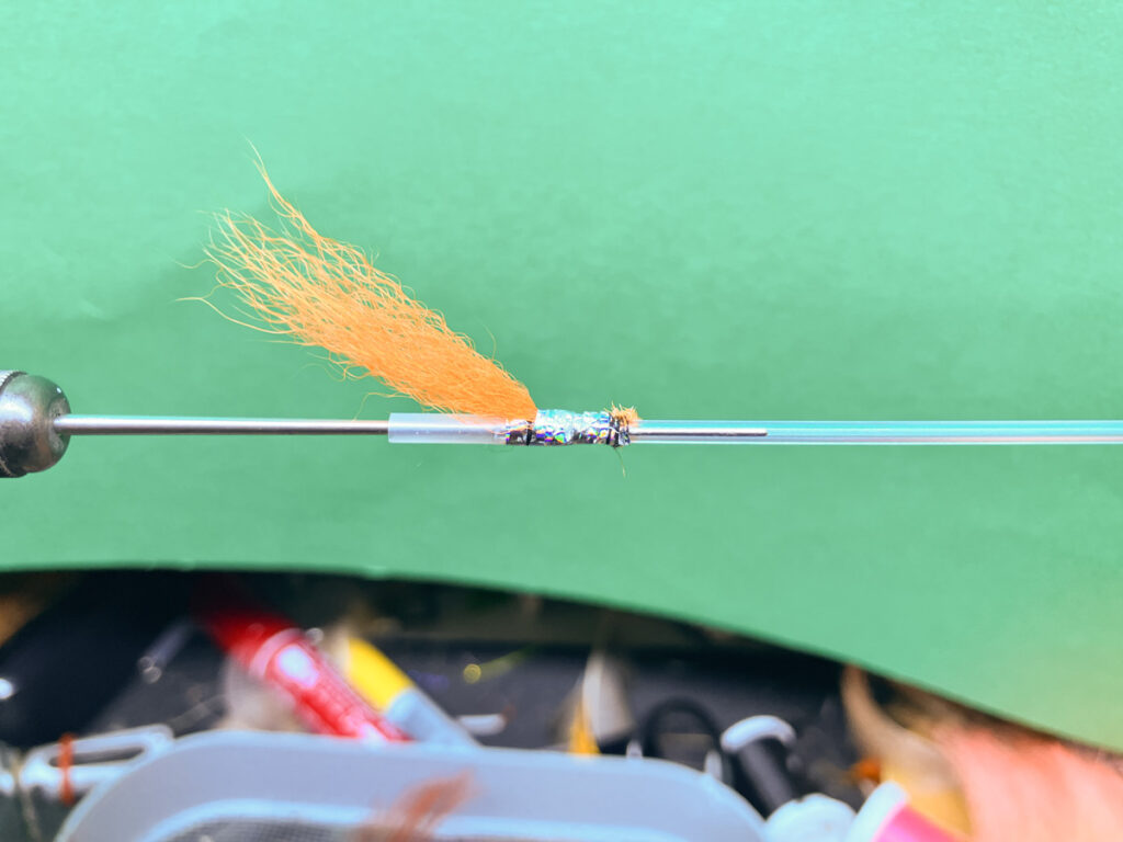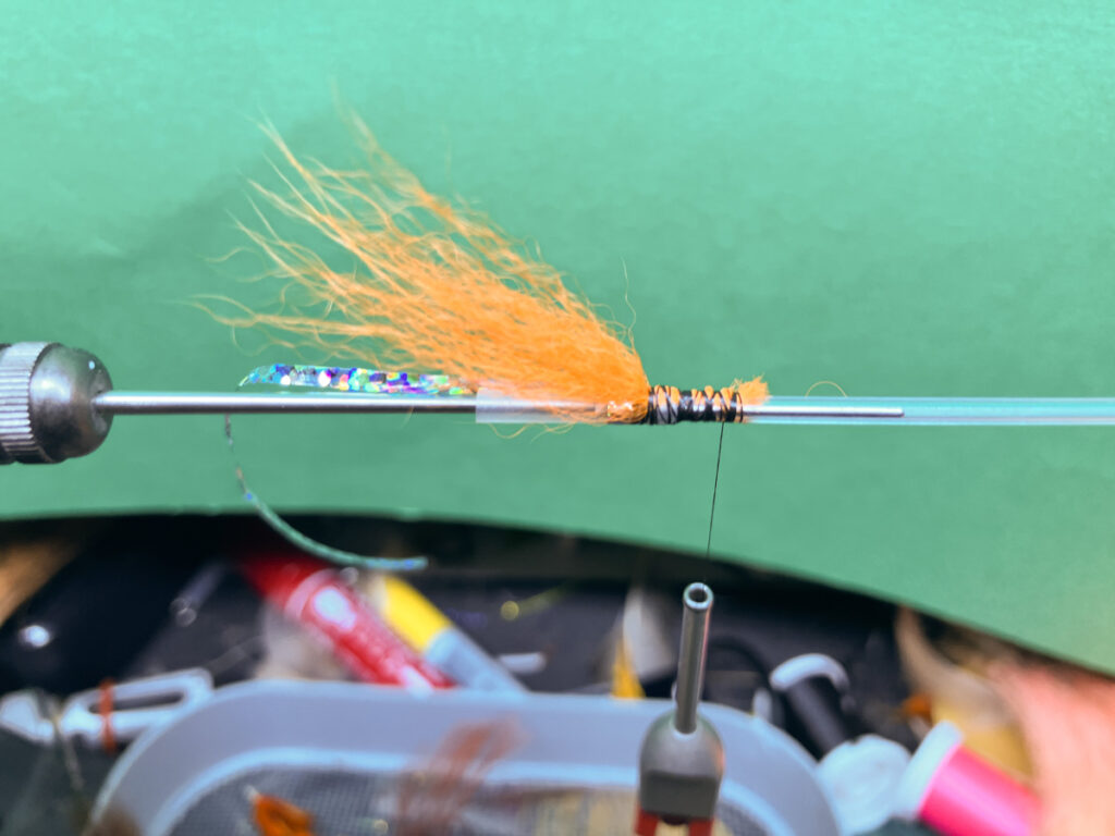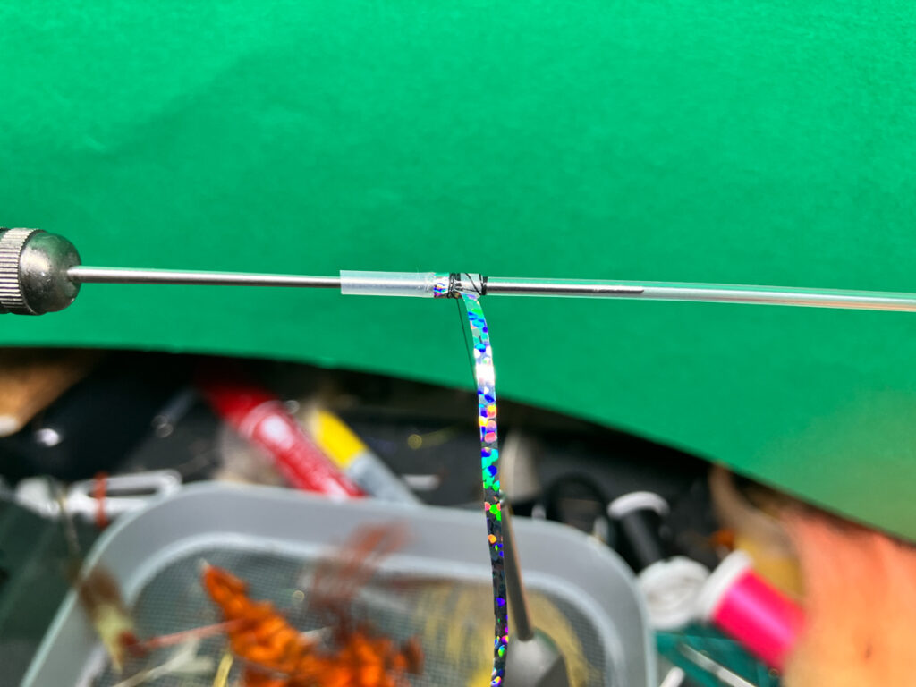 好みのフラットティンセルを取り付けて、重複部分にぴっちり巻いてタグを形成します。