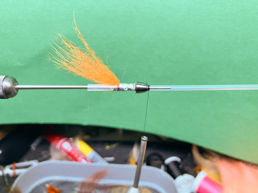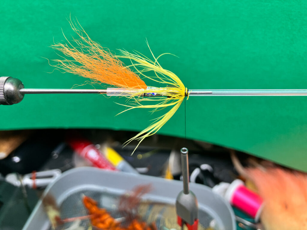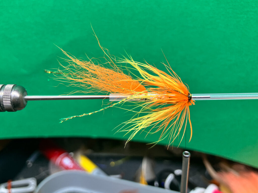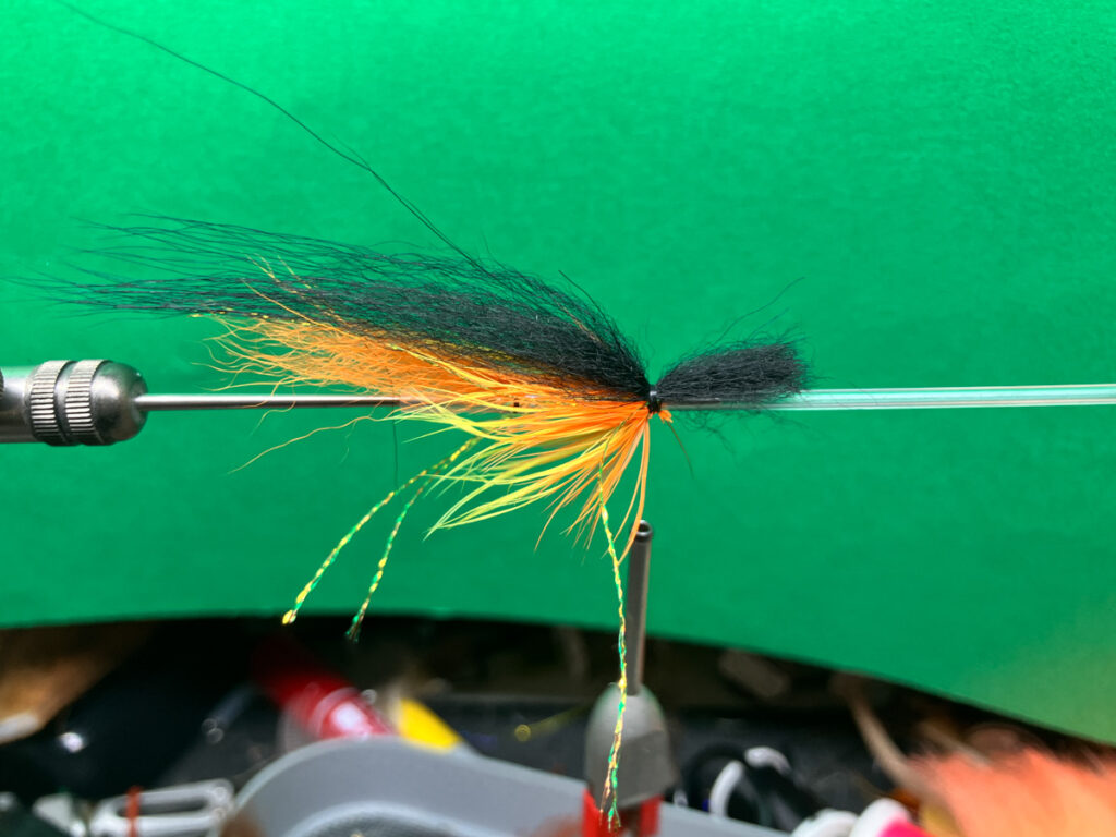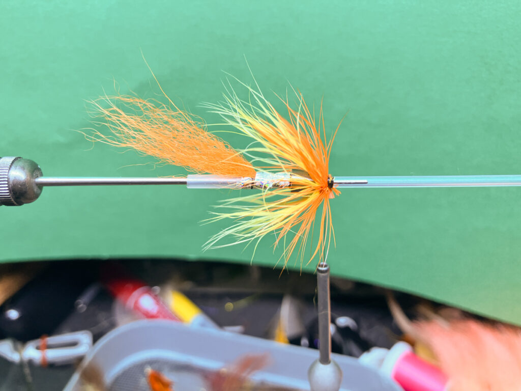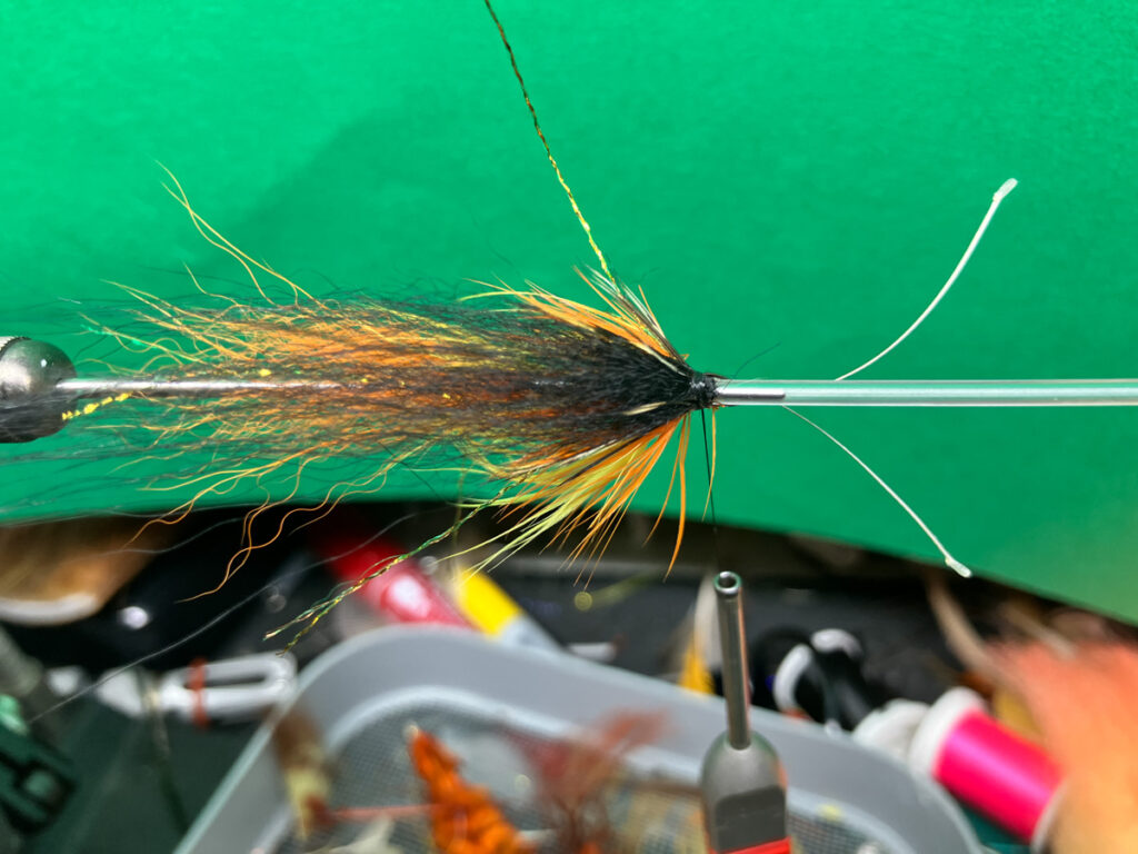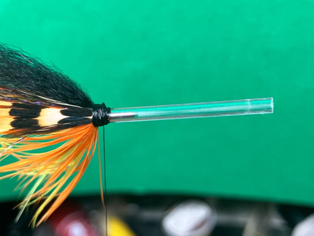 コーンドッグはテンプルドッグよりも素早く沈めたいこと、シングルまたはダブルコーンヘッドを変更しやすくするためにウイングの前にハックリングしません。ストリーマーというよりも5cm程度のマイクロチューブで大型ウェットフライにアレンジしてあります。