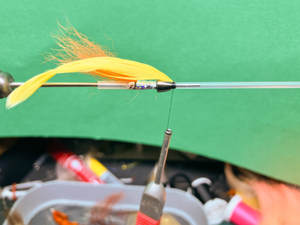 ショルダー用のコーンヘッドを押し込んでから、再びスレッドを取り付けてコーンヘッドがずれないように固定しながらハックルを乗せる下巻をします。