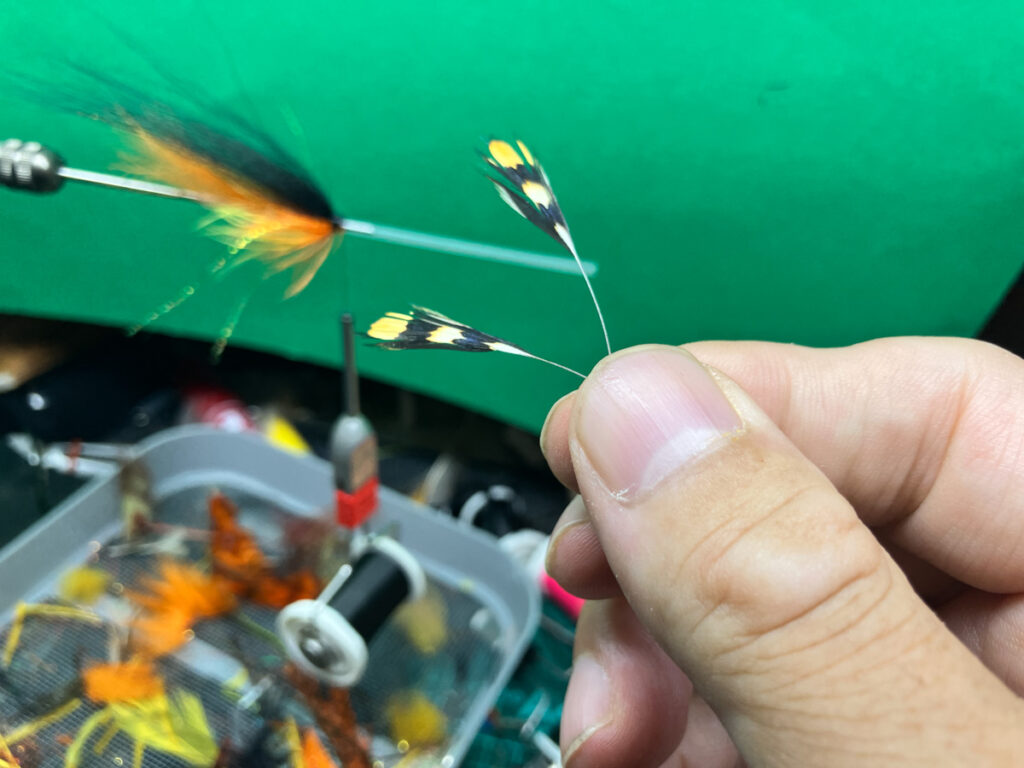 ウイングとなるアークティックフォックスを巻き留めてから、円盤形状になるようにスレッドで整形しながら巻き留め、余分をできる限り綺麗にカットします。