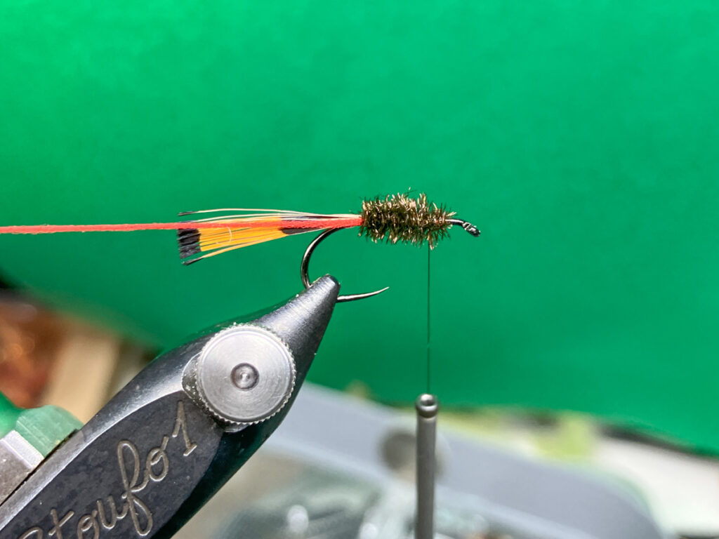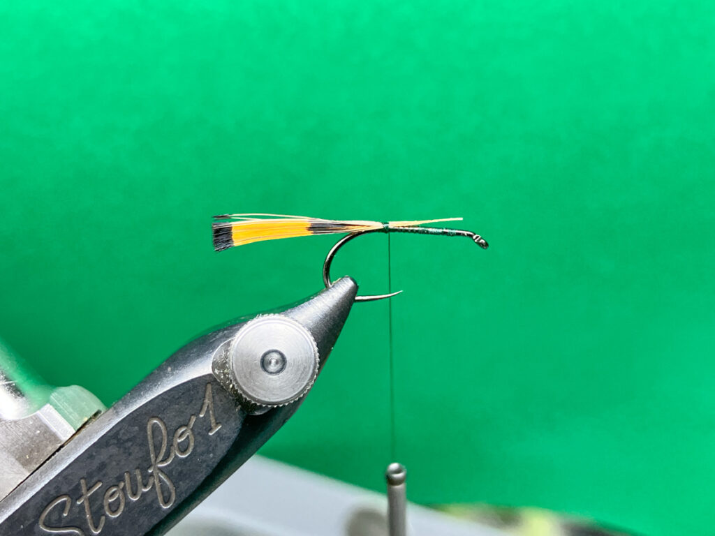 フックサイズに応じて3、4本のピーコックハールの束の先端を揃えてシャンク上部へ取り付け、同じく余分があるようであればスロートの部分でカットします。