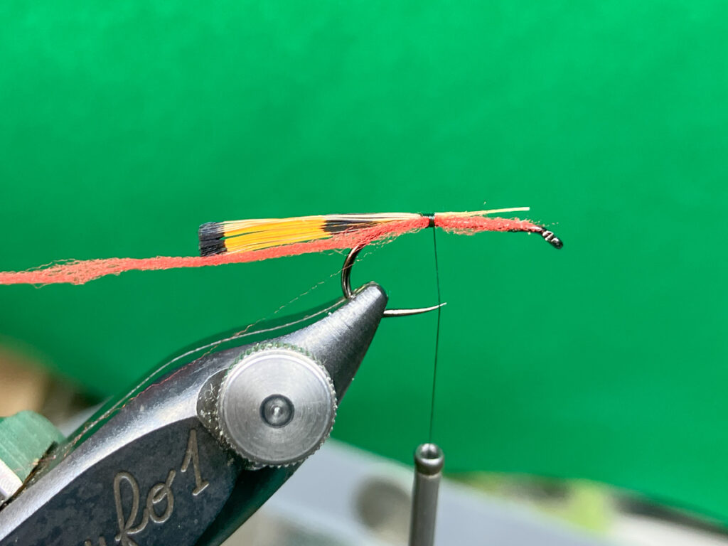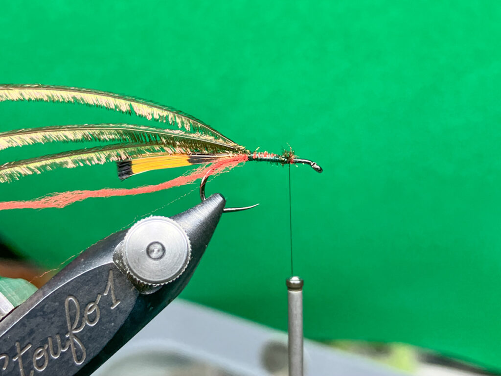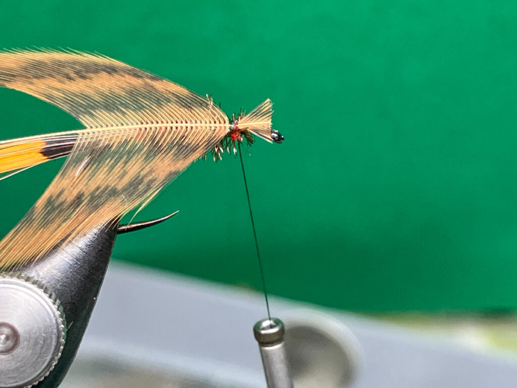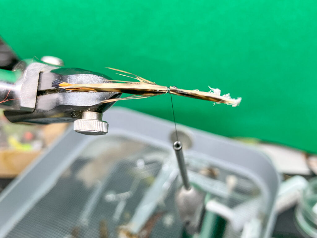 ゴールデンフェザント・ティペットをステムから切り離さずにフックに当てて適切な取り付け位置を確認したら、先端がずれないように切り出してフックシャンク最後端へ固定します。余分な部分はスロートハックルを取り付ける位置でカット。
