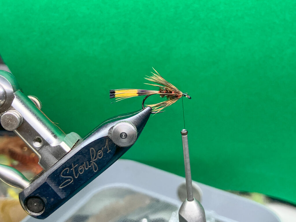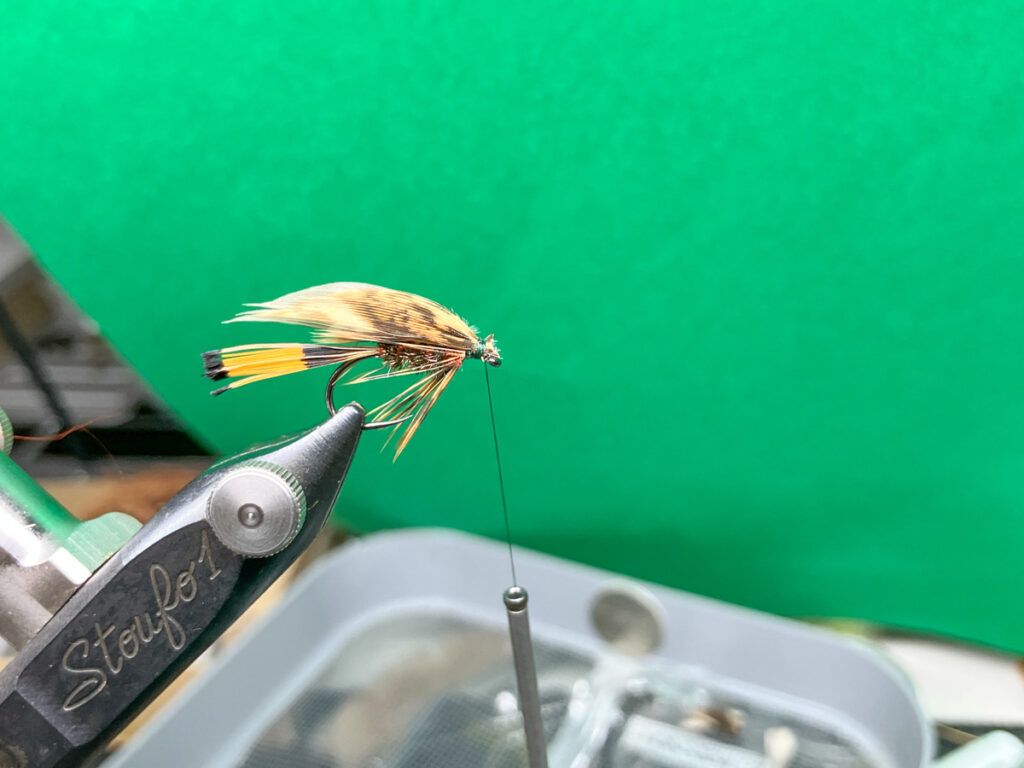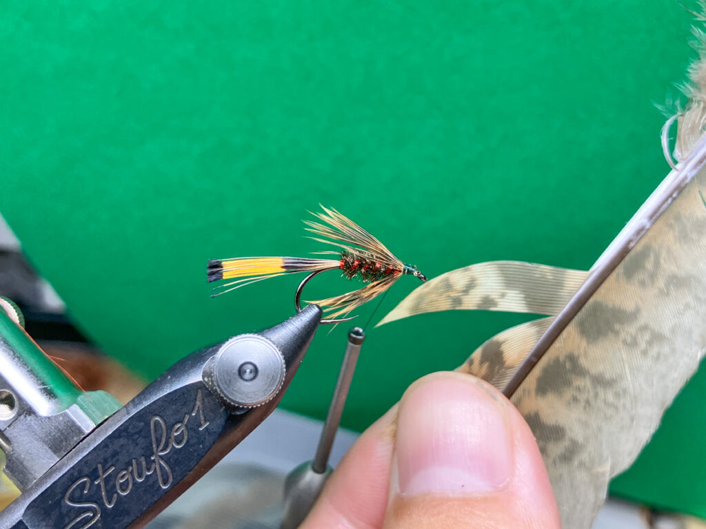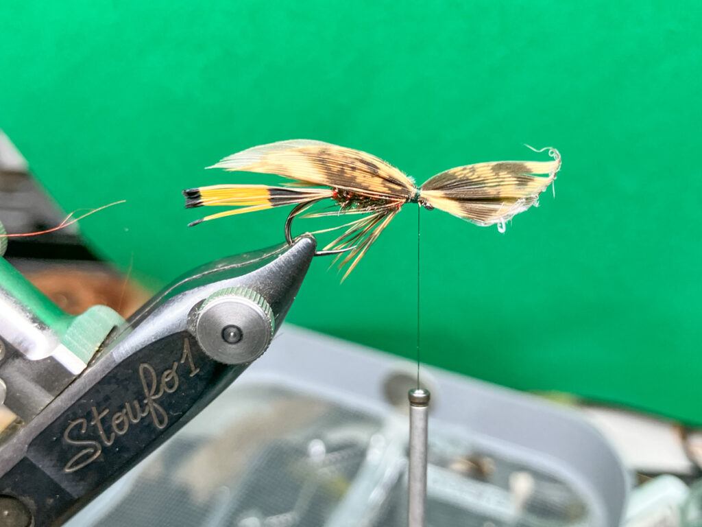 ウイングは浅いレンジで使う場合はヘンフェザントやターキーなどの柔らかいマテリアルを使いますが、本流などでしっかりと沈めたい場合は、ウイングの角度を開くか、硬いピーコッククイルを使ってください。