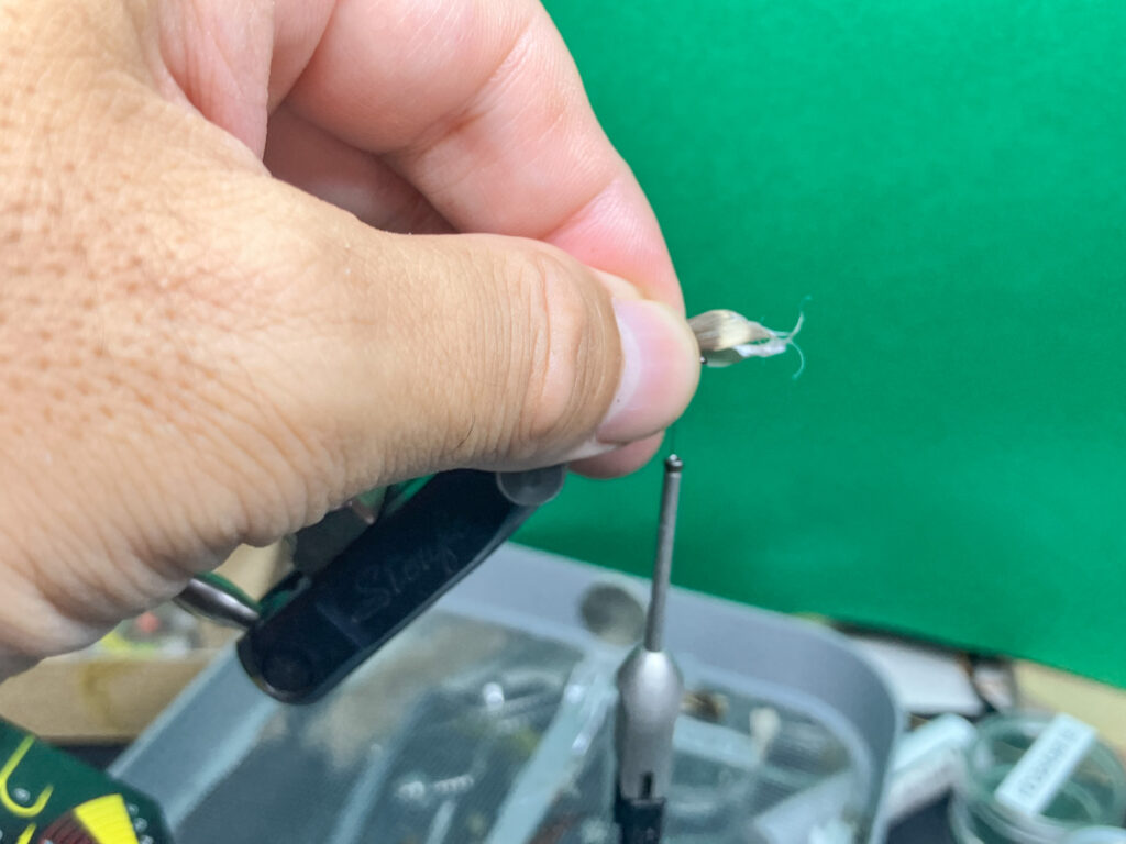 ハール同士が潰しあってボリューム痩せしてしまうことを防ぐため、ピーコックハールの束をハックルプライヤーでまとめて掴んで固定します。