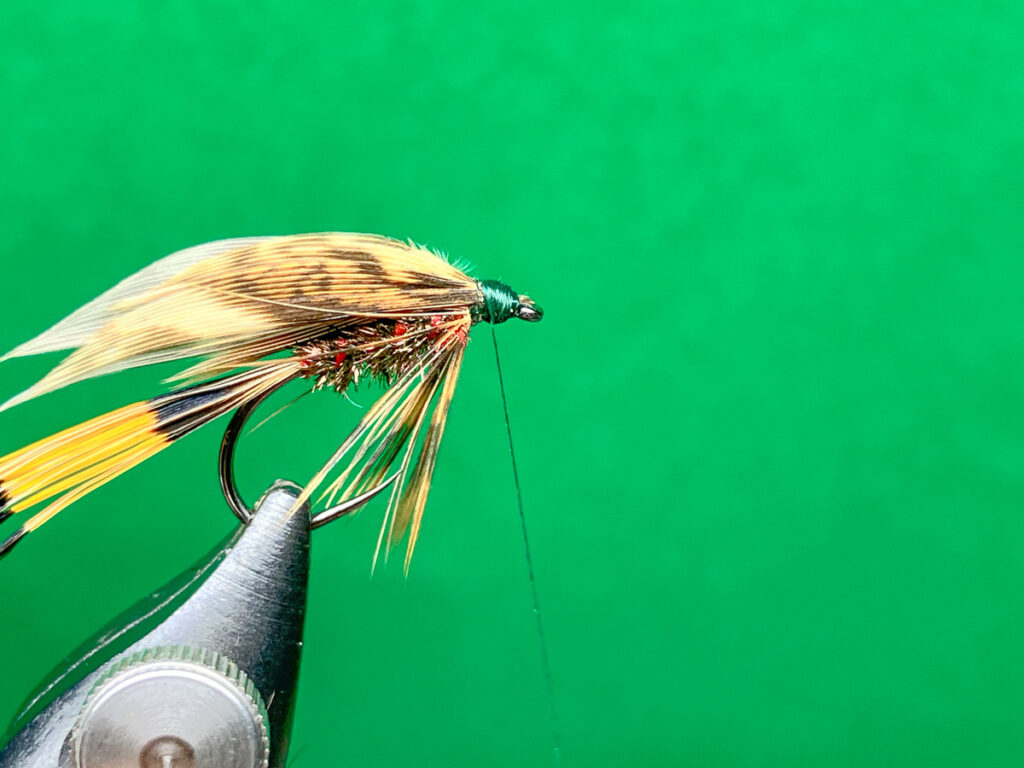 全体のプロフィールはカディスやヤゴ、テレストリアルのイミテーションとして機能しつつ、クイルウイングが水流を捉えて狙ったレンジへ沈んでからのターン&スイングを可能とし、ゴールデンフェザントのティペットが水中で震えて魚を誘います。