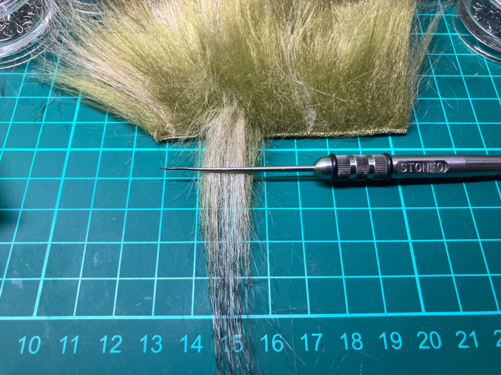 ロングヘアーのファイバーを巻き潰さないように後方へなでつけつつ、フックシャンクの後端2/3の位置まで巻きつけてアンダーボディを形成します。