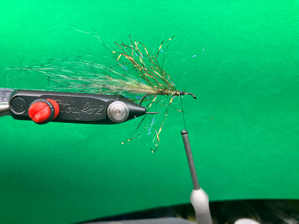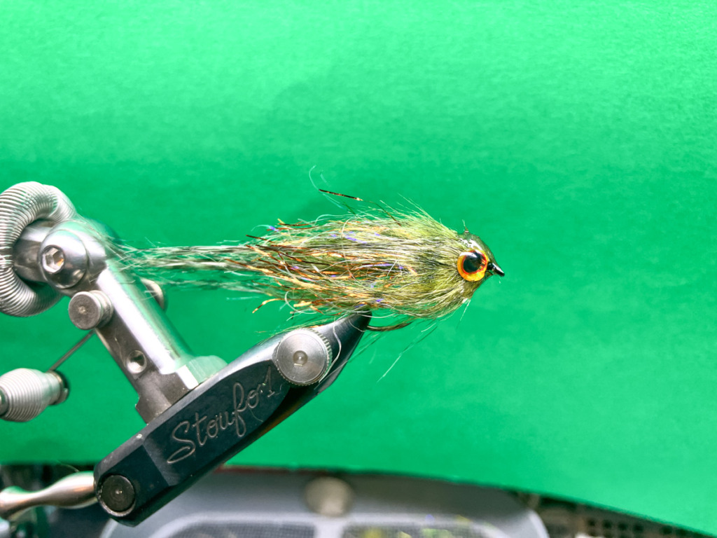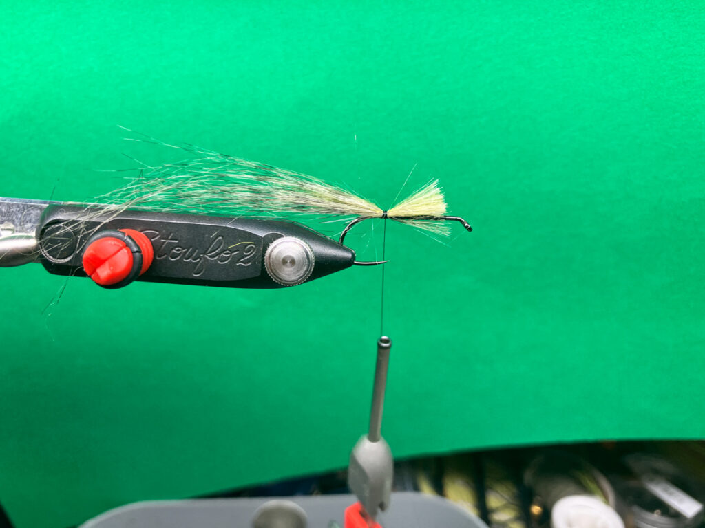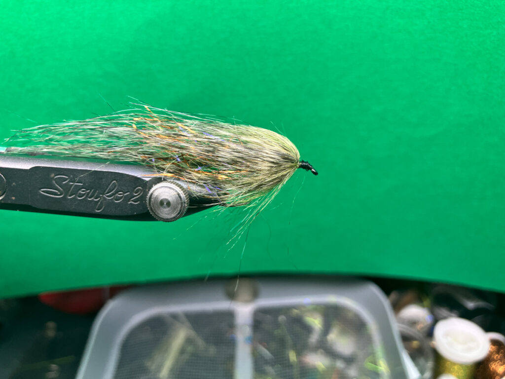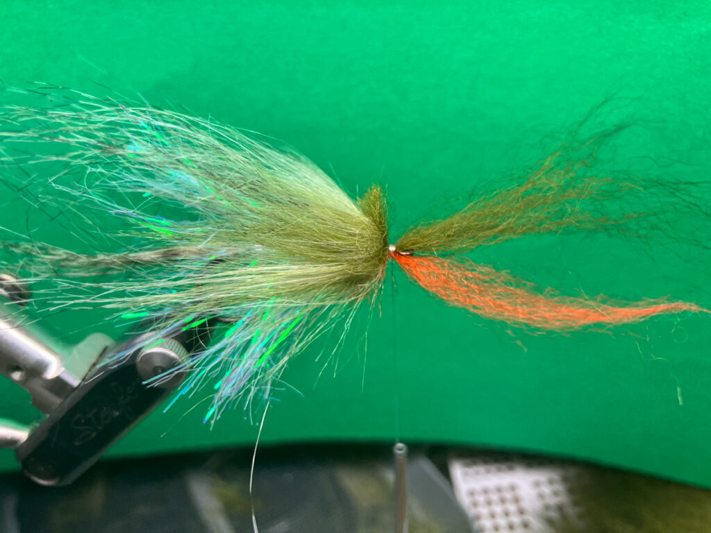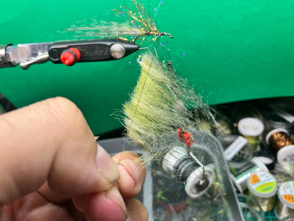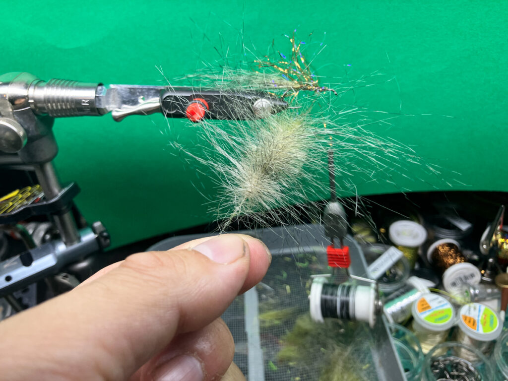 ウグイサイズで水押し効果とポットベリー化する為に、ラムズウールの背中用(オリーブなど)とベリー用(オレンジ)を逆付けしてから、ヘアパッカーを使って後方へ押しつけてからヘッドをフィニッシュします。