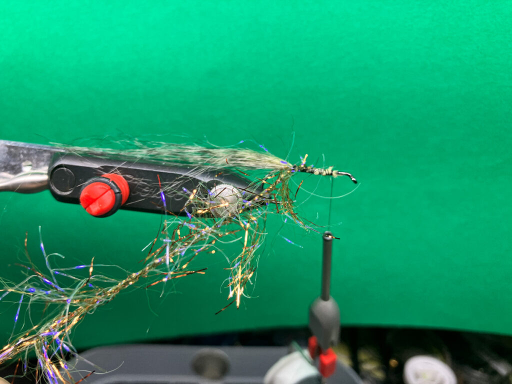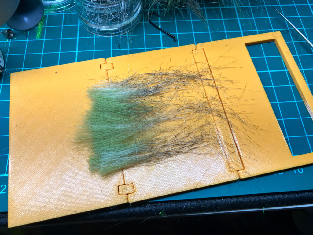 オーバーボディーとして使うクラフトファーをブレンドマスタークランプの上にコンポジットハックルとしてセットしておきます。