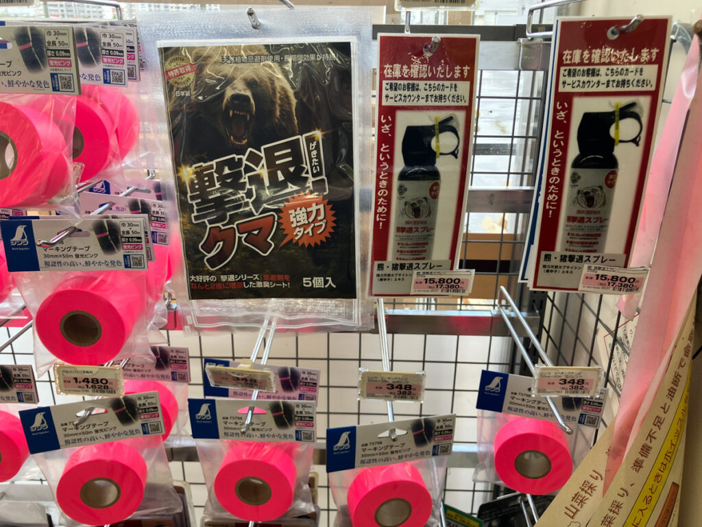 それにしてもさすが「出没注意!」の怖い袋ラーメンで一世風靡した旭川。あらゆるクマ対策グッズが販売されていますが、熊撃退スプレーも最高峰の「カウンターアーソルト」です。効果の怪しい「激臭シート」もありますが、気になるのは怒涛の量の「ピンテ」ことピンクテープ。
