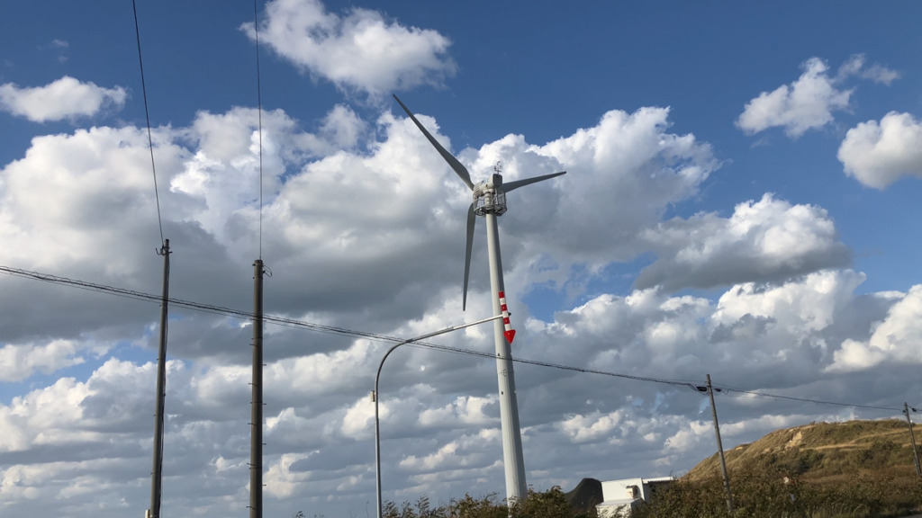 オロロン名物「風力発電」も間近で撮影。空との対比がエモいので素材になります。こんだけ数が並んでいるとなると、年間のバードストライクも焼き鳥屋がやれるくらいあるんだろうな・・・。