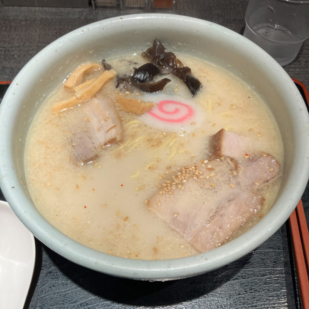 JR旭川駅前のこともあって、列ができていますが、タイミング良くあまり待たずに座れました。分家・風来居と同じスープとチャーシューですが、具にナルトと梅干しが追加されるのが違うところ。ゴマも少なめなのは麺との相性でしょうか? 麺は本家の方が太めですが、ほぼ同じ。気のせいか塩分控えめ?