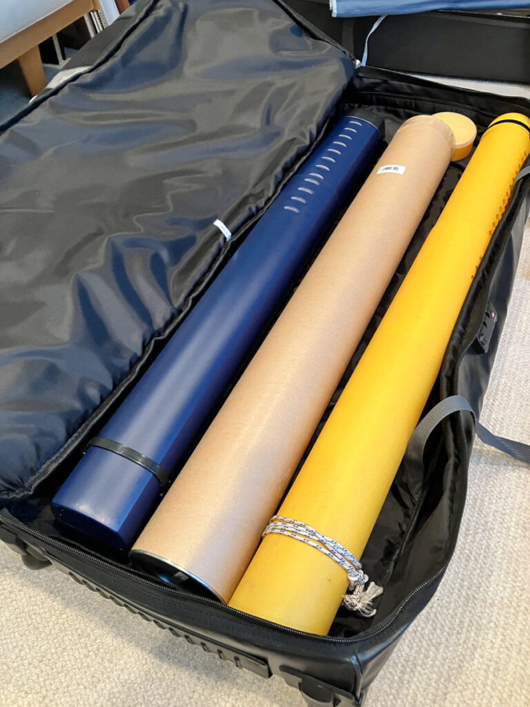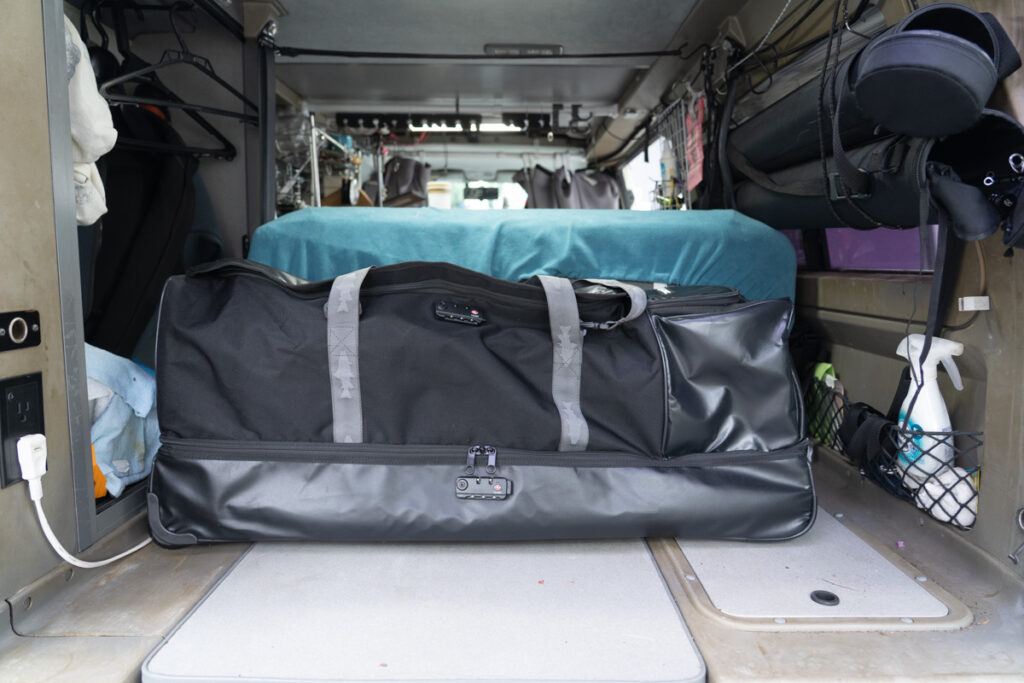 2025年シーズンから投入したのは、JMCの「トラベルキャリーバッグ ボヤージャー V2」。ぱっと見は普通のキャリーハンドルと車輪付きのスーツケースタイプですが、なんと仕舞寸90cmまでのロッドチューブの太めのものが3本まで収納できてしまうので、パックロッドやマルチピースロッドであれば6本収容できる上に、ウェーディング装備やリールバッグ、タックルケース、最小限のタイングキットや車中泊グッズも入れられる収納力です。