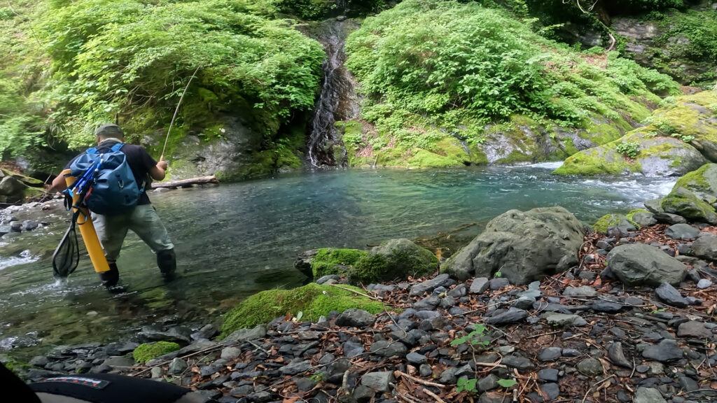 現地でキャリーケースに収納しておいたロッドチューブをサイドに装着して、大きい移動や足場が悪い難所ではロッドは出さずに両手が使える状態で使っています。