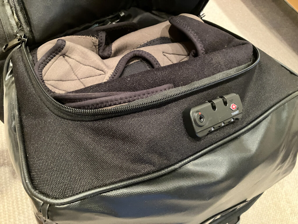 上段の小さい方のコンパートメントにはウェーディング装備が収納できます。ウェーディングシューズ、ドライソックス、ゲーターで丁度いいので、薄手のゴアテックスウェーダーなら折り畳めば入ります。