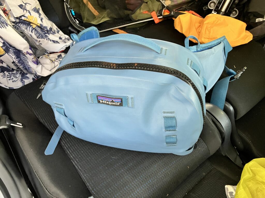 私の場合はソルトの釣りで便利なことやカメラ機材の防水性を担保する必要があるため、パタゴニア 「ガイドウォーター・ヒップパック9L」を使用して、この中に雨具となる上着を入れてあります。