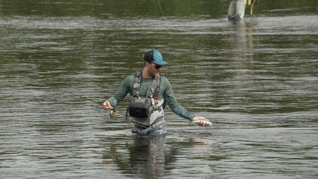 さらにセミオート式のフライリールはロッドを持つロッドハンドのみでリール操作も完結できるため、足場の悪い川での立ち回りや移動のスピード向上、釣るときの手返しも素早くなるので、競技選手たちには愛用されています。